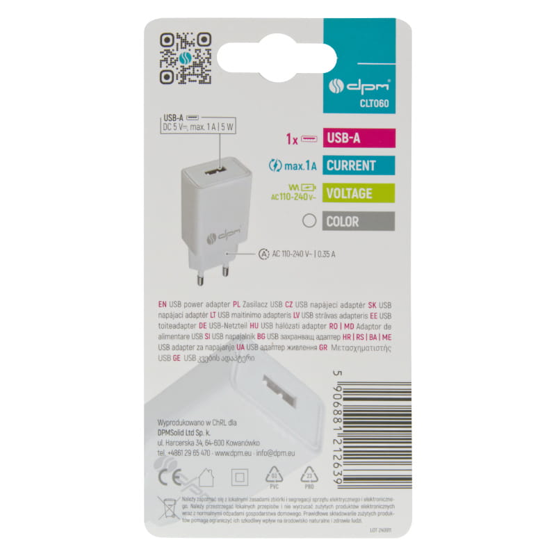 Ładowarka sieciowa USB CLT060 to kompaktowe urządzenie, które doskonale sprawdzi się jako adapter zasilania dla Twoich urządzeń elektronicznych. Dzięki jednemu gniazdu USB typu A i wyjściowemu napięciu DC 5 V, max. 1 A (5 W), ładowarka jest idealnym rozwiązaniem do ładowania smartfonów, powerbanków oraz innych drobnych urządzeń zasilanych poprzez port USB.