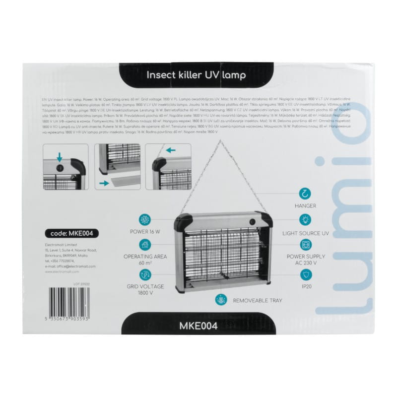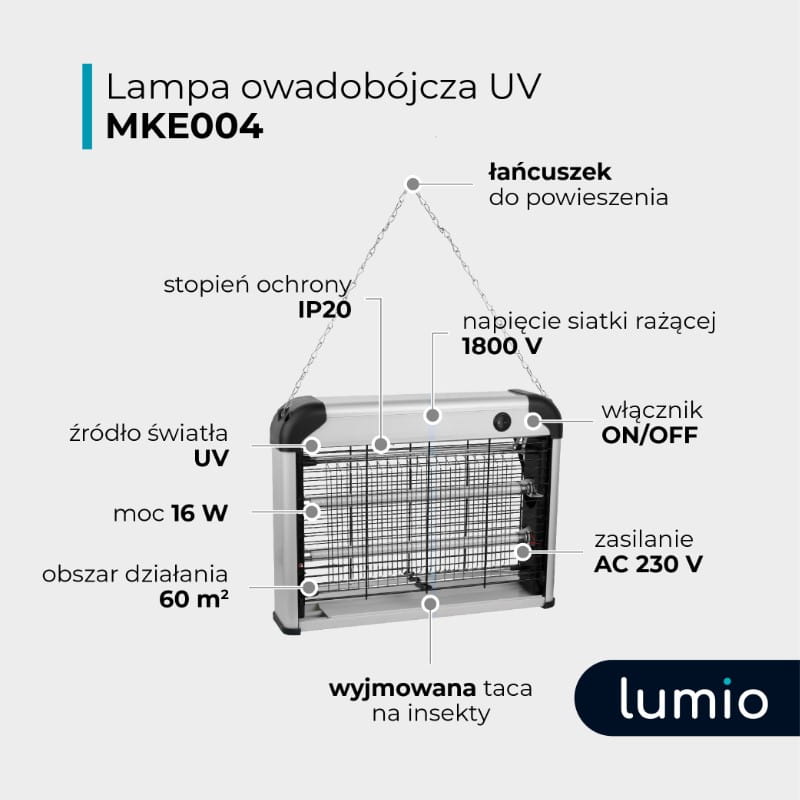 Lampa owadobójcza UV MKE004 LUMIO to niezawodne urządzenie do eliminacji owadów w pomieszczeniach o powierzchni do 60 m2. Dzięki mocy 16 W i wysokiemu napięciu rażącemu 1800 V, skutecznie zwalcza owady, zapewniając higieniczne i wolne od insektów środowisko.