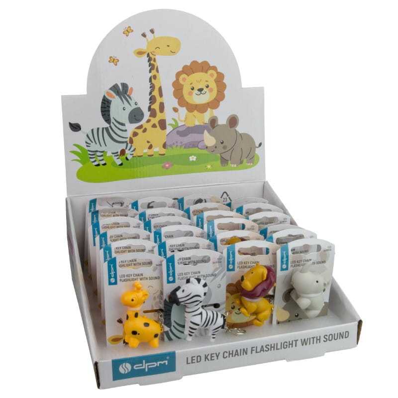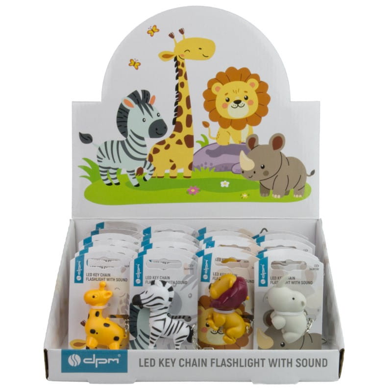 Latarka dostępna jest w mixie zwierzątek, obejmującym żyrafę, lwa, nosorożca i zebrę, po 6 sztuk każdego modelu w displayu. To różnorodność, która przypadnie do gustu każdemu użytkownikowi, szczególnie dzieciom, dla których odgłosy dzikich zwierząt stanowią dodatkową atrakcję.