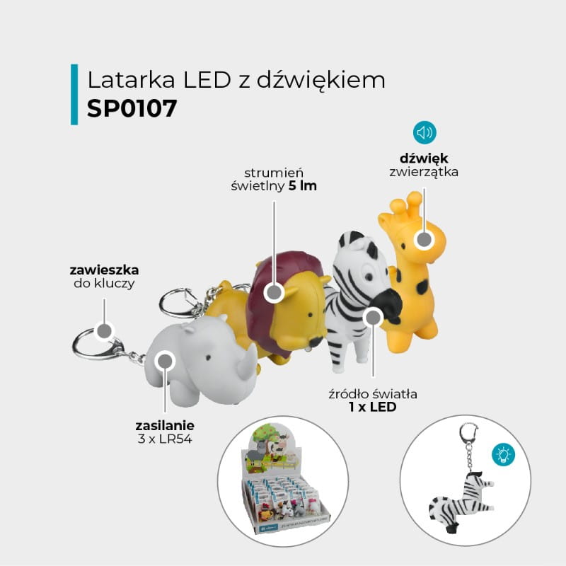 Latarka LED breloczek SP0107 to praktyczne i zabawne urządzenie, które łączy w sobie funkcję latarki oraz odgłosy inspirowane dzikimi zwierzętami. Dzięki modelom w kształcie żyrafy, lwa, nosorożca i zebry, breloczek jest idealnym dodatkiem zarówno dla dzieci, jak i dorosłych miłośników fauny.