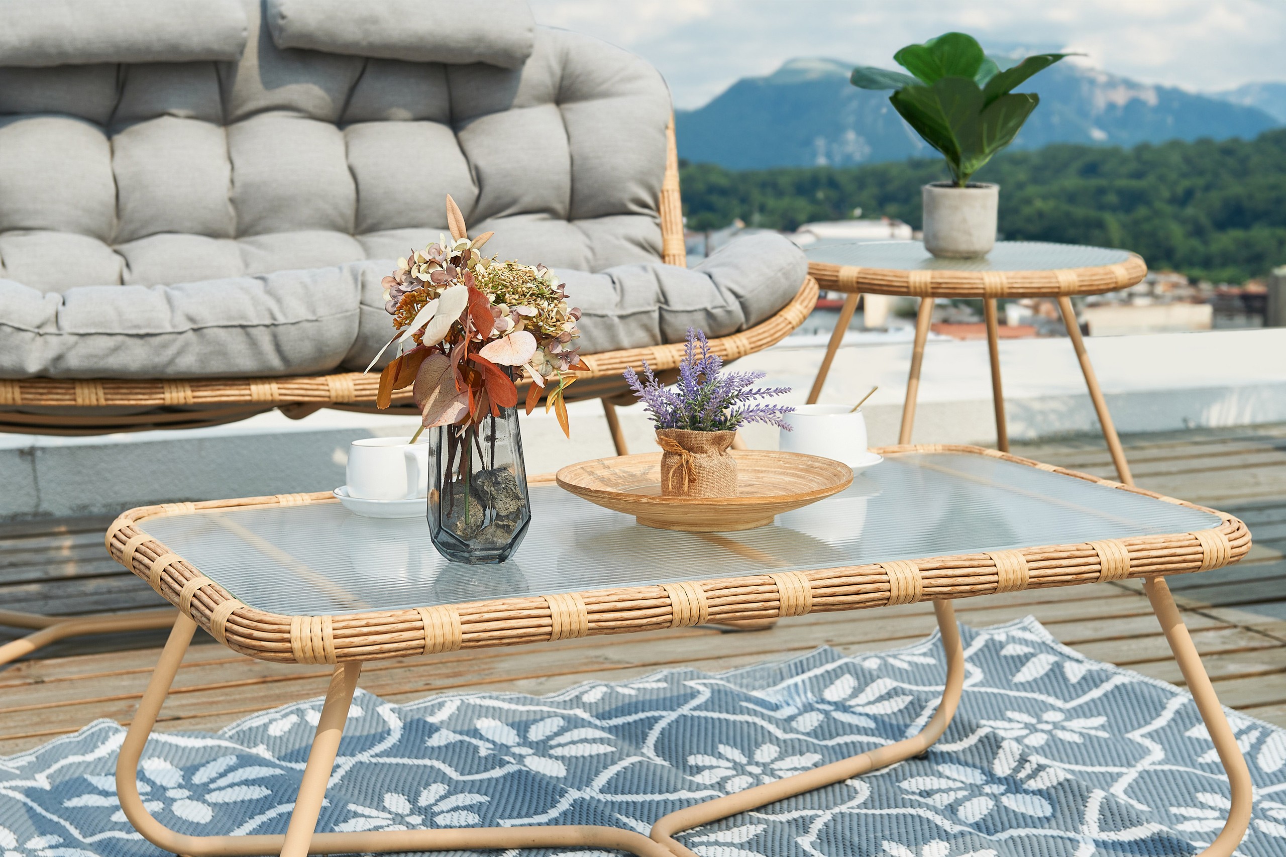 Zestaw mebli ogrodowych Palermo to komfortowy i stylowy komplet wypoczynkowy, idealny na taras lub balkon. Składa się z kanapy, dwóch foteli i prostokątnego stolika z hartowanym szkłem karbowanym. Wykonany z malowanego proszkowo aluminium i technorattanu, zestaw jest odporny na warunki atmosferyczne i uszkodzenia mechaniczne. Miękkie poduchy na siedziskach i oparciach zapewniają wygodę, a stonowana kolorystyka pasuje do różnych stylów aranżacji.