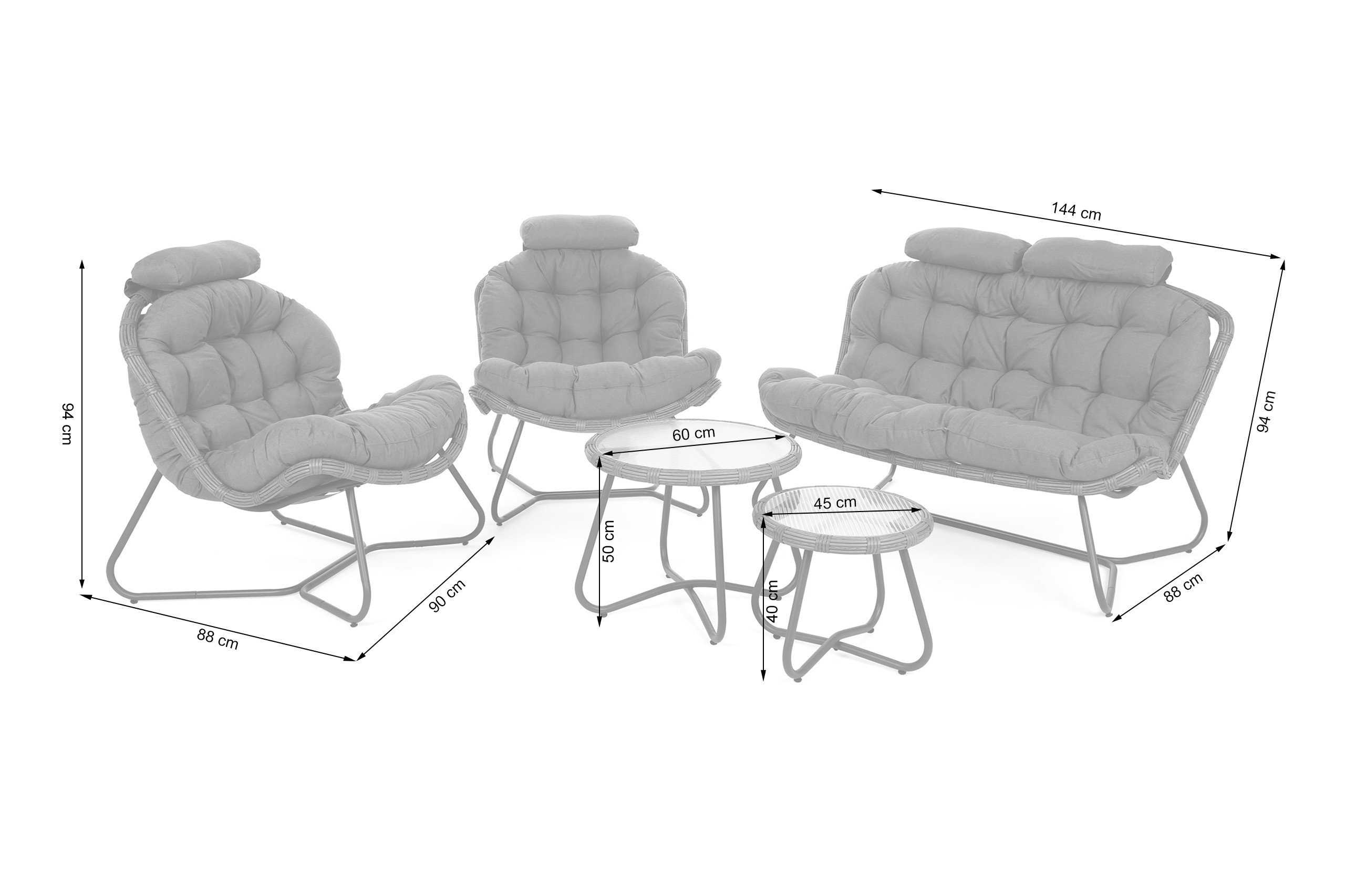 - W komplecie 2 stoliki, 2 fotele, sofa, poduchy do foteli i sofy, szklany blat do stolika.