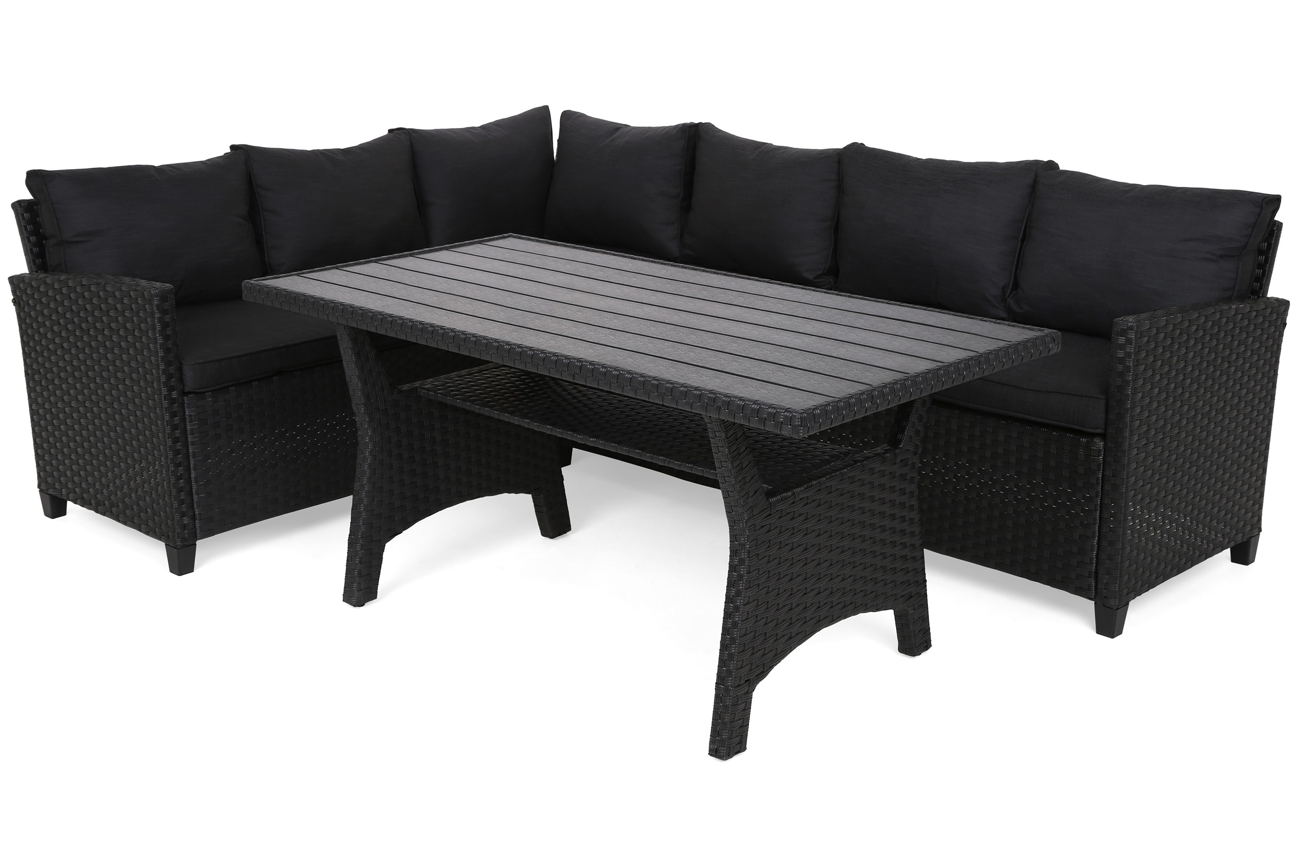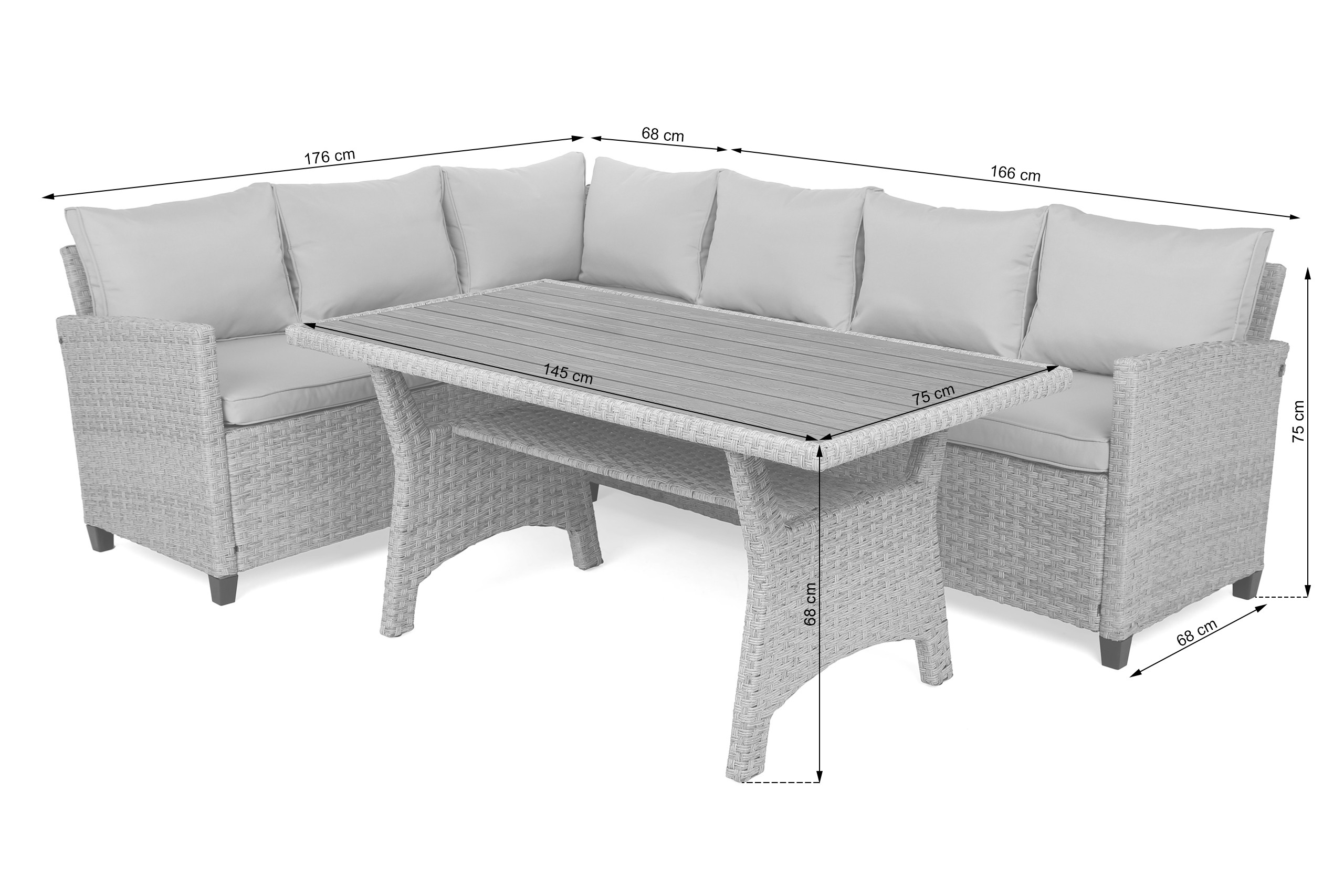 Narożnik Lagos z technorattanu to elegancki dodatek do każdego ogrodu lub tarasu. Obszerne siedzisko pomieści bez problemu sześć osób, a miękkie i stylowe poduszki zapewnią wygodę. Mimo swoich rozmiarów, zarówno stół, jak i narożnik są bardzo lekkie. Zestaw składa się z dwóch narożnych segmentów sofy, wysokiego stolika oraz poduszek. Technorattan z którego wykonany jest narożnik imituje naturalny rattan, ale jest znacznie bardziej odporny na zmienne warunki atmosferyczne, promieniowanie UV czy wilgoć.