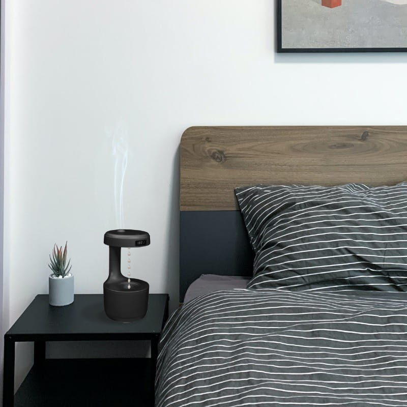 Ten czarny nawilżacz powietrza do pokoju wykorzystuje technologię antygrawitacyjną, która utrzymuje odpowiedni poziom wilgotności powietrza.