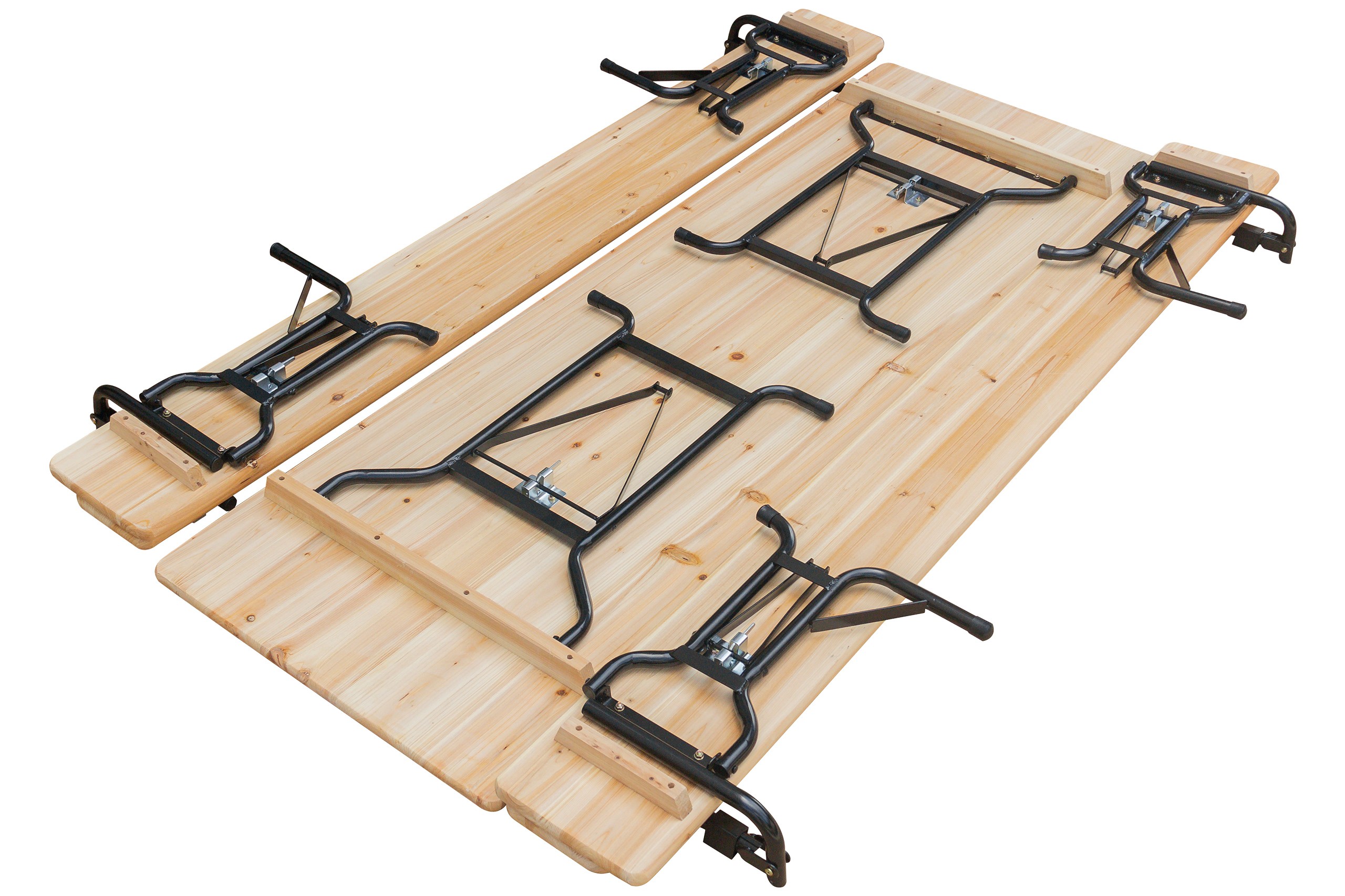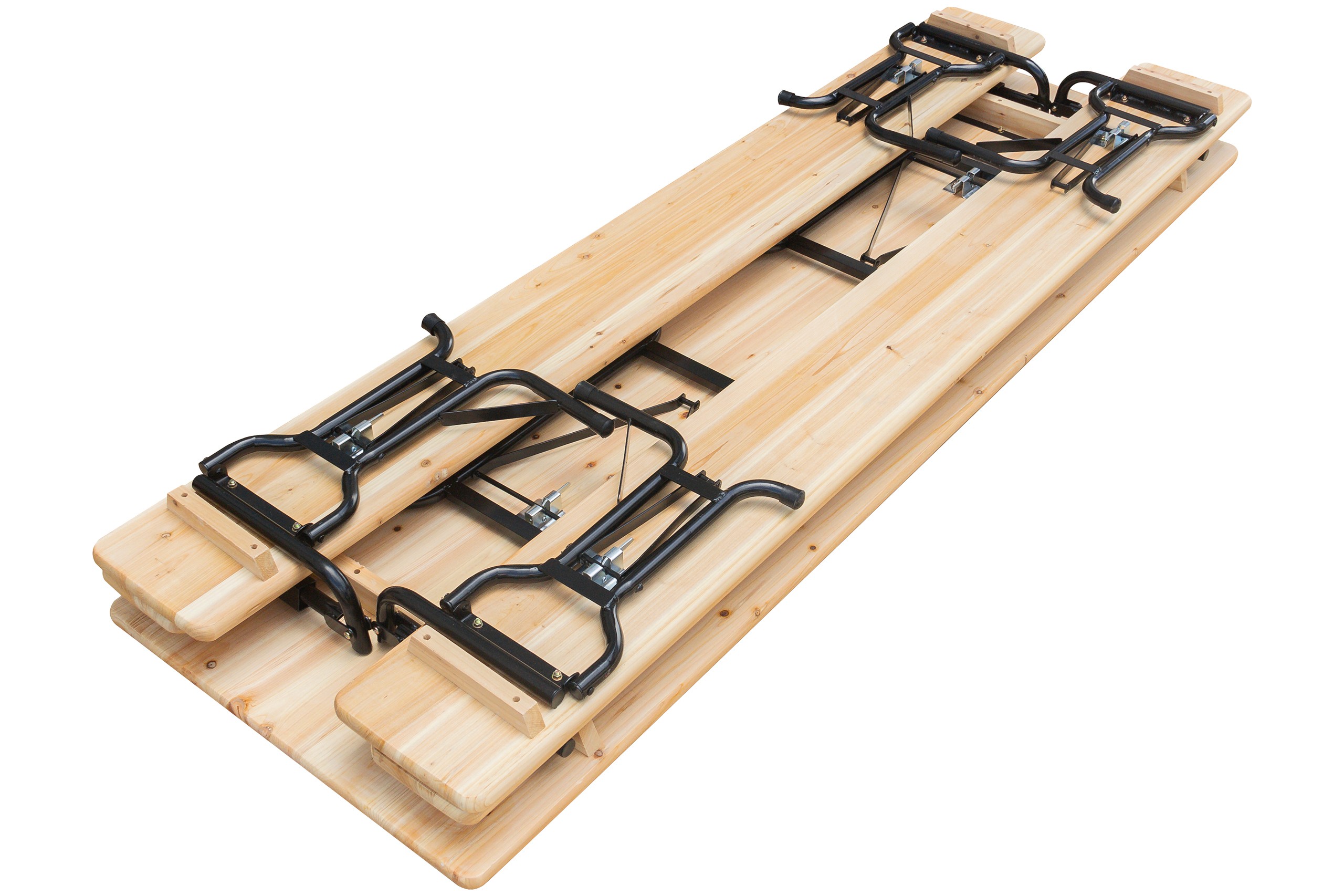 - Wymiary po złożeniu (szer. x gł.) stół: 217 cm x 70 cm / ławka 217 cm x 25 cm / łączna wysokość: 17 cm.