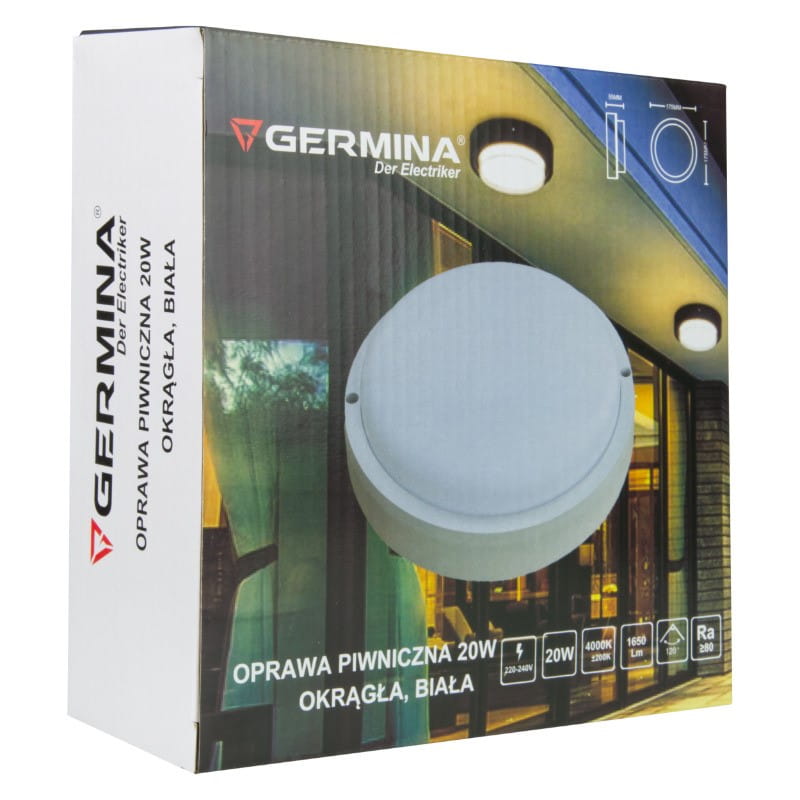 Oprawa piwniczna LED GERMINA GW-0162 to doskonałe rozwiązanie do oświetlania piwnic, garaży, korytarzy, magazynów i innych przestrzeni, które wymagają intensywnego i równomiernego oświetlenia. Z mocą 20 W i strumieniem świetlnym 1660 lm, zapewnia jasne i skuteczne światło, idealne do wymagających warunków.