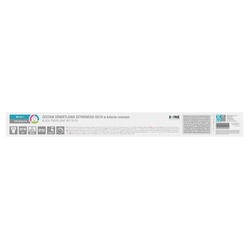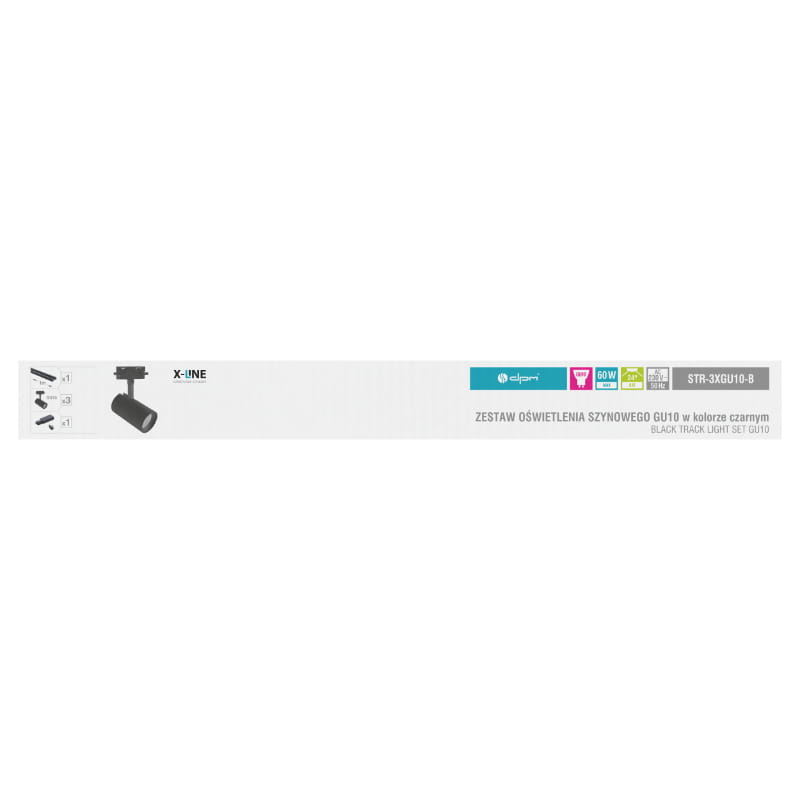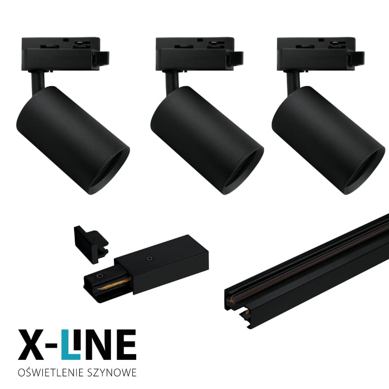 W zestawie szynowym X-LINE znajdują się jedna szyna 1-fazowa STS długości 1 m, trzy reflektory GU10 (bez żarówki) oraz złączki końcowe.