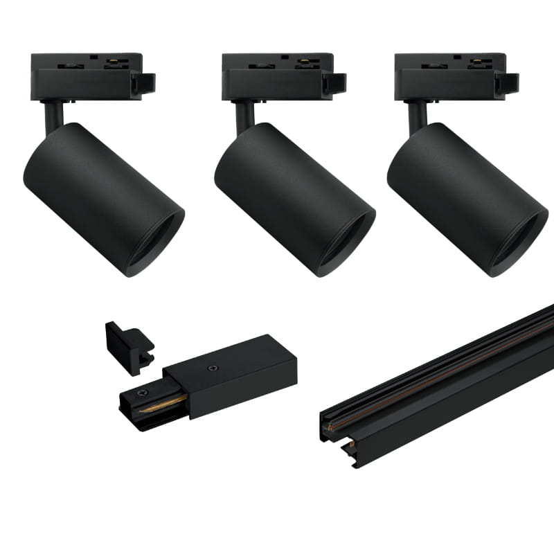 Reflektory szynowe GU10 czarne montuje się na szynach oświetleniowych. Każdy z trzech reflektorów wymaga zastosowania dowolnie wybranej żarówki LED GU10 (zestaw nie zawiera żarówek).