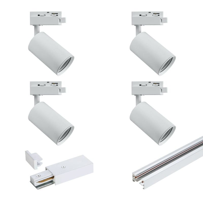 Reflektory szynowe GU10 białe montuje się na szynach oświetleniowych. Każdy z czterech reflektorów wymaga zastosowania dowolnie wybranej żarówki LED GU10 (zestaw nie zawiera żarówek).
