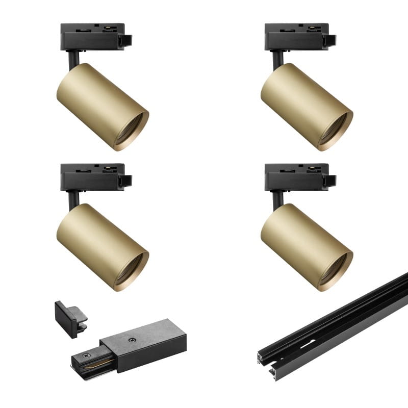 Reflektory szynowe GU10 złote montuje się na szynach oświetleniowych. Każdy z czterech reflektorów wymaga zastosowania dowolnie wybranej żarówki LED GU10 (zestaw nie zawiera żarówek).