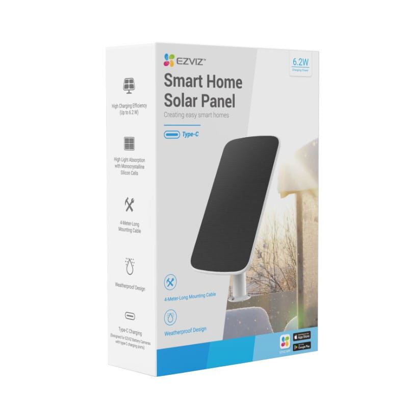 Panel solarny do kamer EZVIZ wyposażonych w port ładowania typu USB C. Max moc: 6,18 W. Napięcie zasilania: 6 V, 1030 mA.Długość przewodu: 4 m. IP65. Wymiary: 283,7 x 185,7 x 2,4 mm. Zestaw zawiera: panel słoneczny, regulowany wspornik montażowy, akcesoria montażowe, szablon otworów. Opakowanie: pudełko