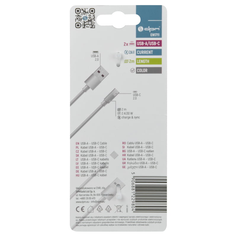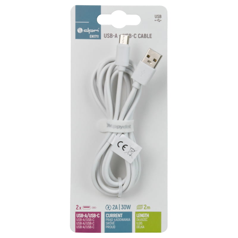 Przewód USB A - C to niezawodne akcesorium do ładowania i synchronizacji danych między urządzeniami. Obsługuje standard USB 2.0 oraz prąd ładowania do 2 A (30 W), co zapewnia stabilne i efektywne działanie. Długość 2 m umożliwia wygodne użytkowanie, nawet gdy gniazdko znajduje się dalej, a biały kolor nadaje mu estetyczny wygląd.