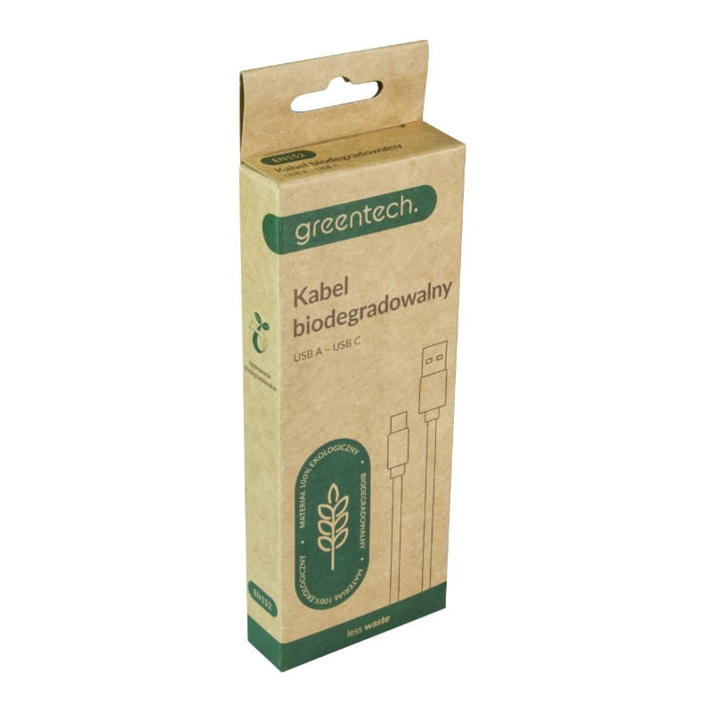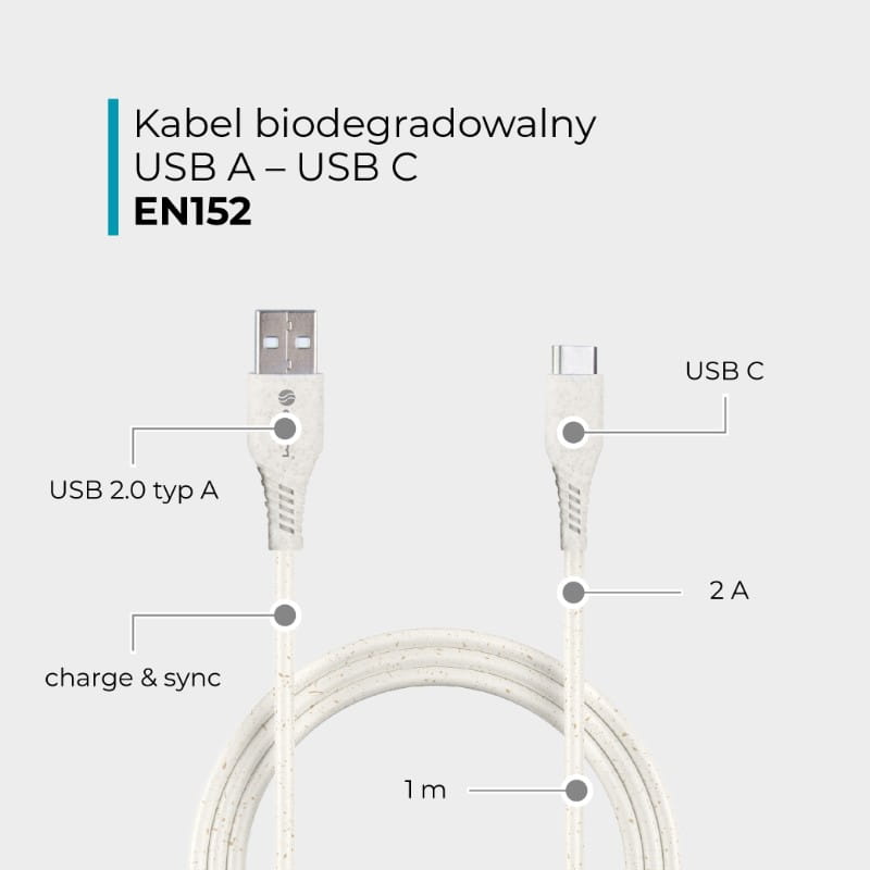 Przewód USB A - C EN152 to doskonałe połączenie nowoczesnej technologii i dbałości o środowisko. Wykonany z biodegradowalnych polimerów roślinnych i słomy pszenicznej, przewód zapewnia funkcjonalność, trwałość i odpowiedzialne podejście do ekologii.