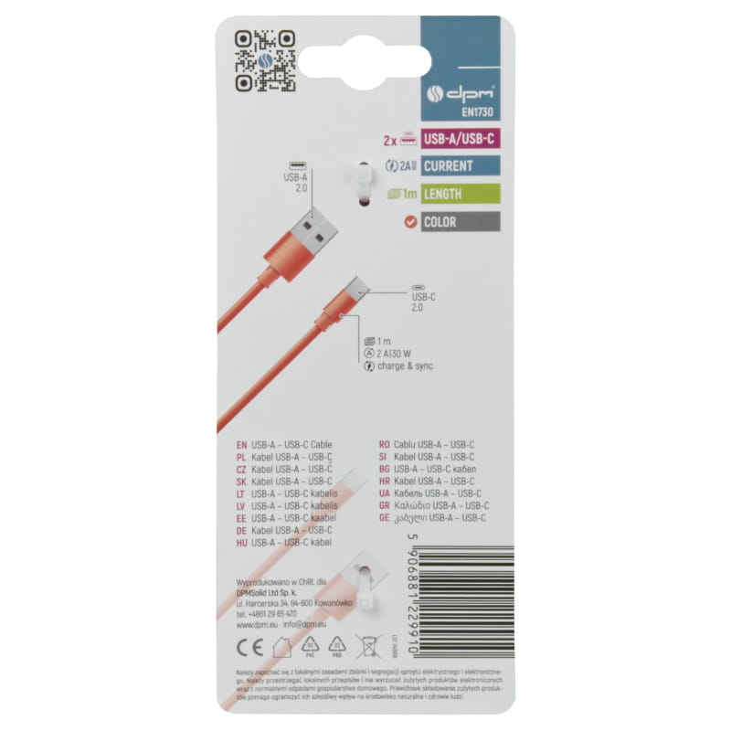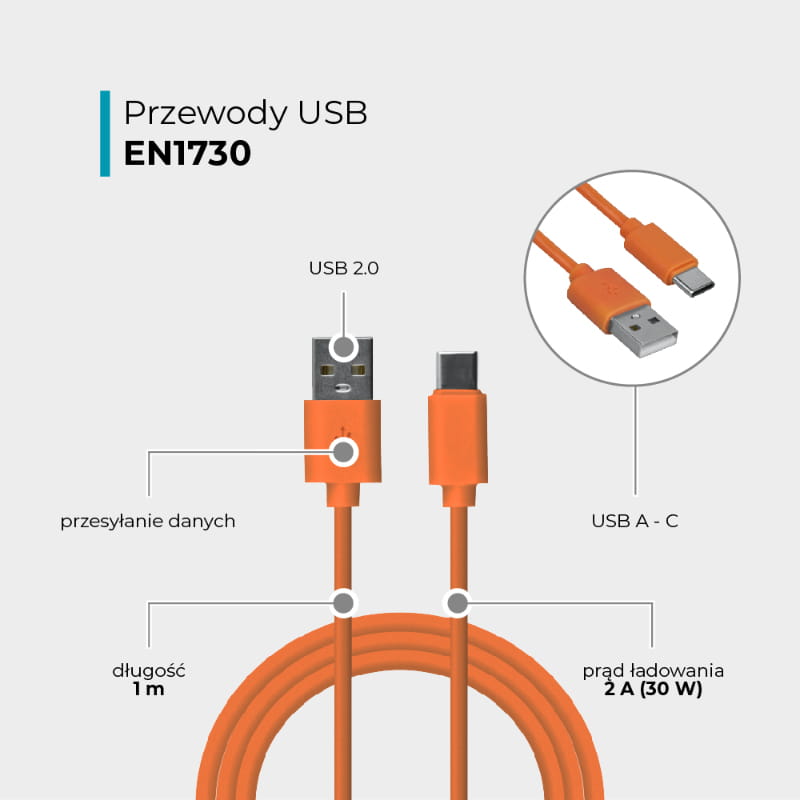 Przewód USB A - C to niezbędne akcesorium do ładowania i synchronizacji danych między urządzeniami. Dzięki kompatybilności z USB 2.0 oraz maksymalnemu natężeniu ładowania 2 A (30 W) przewód zapewnia stabilne i efektywne działanie. Długość 1 m sprawia, że jest idealnym wyborem do codziennego użytku, a pomarańczowy kolor dodaje mu estetycznego wyglądu.
