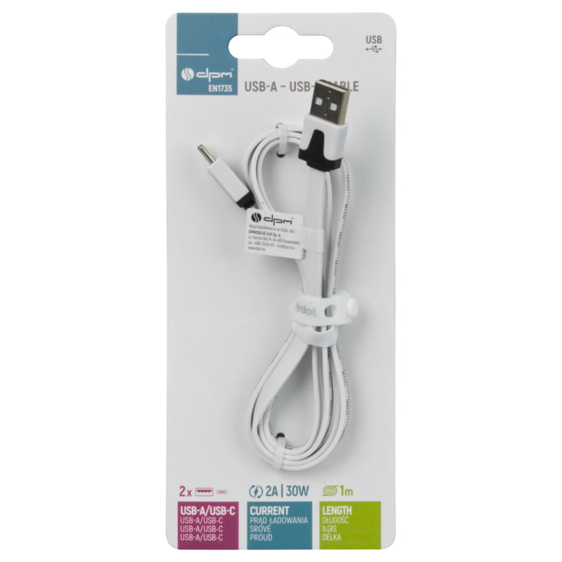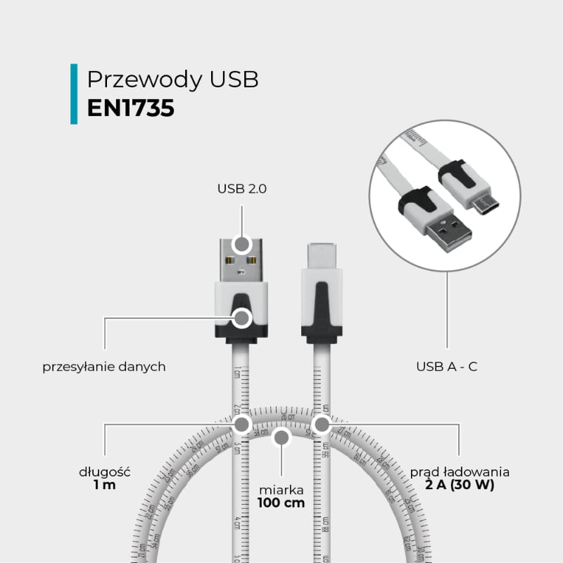 Przewód USB A - C z miarką to innowacyjne akcesorium, które łączy funkcję ładowania i transmisji danych z dodatkową wygodą w postaci wbudowanej miarki. Obsługuje standard USB 2.0 i maksymalne natężenie ładowania 2 A (30 W), co zapewnia stabilne i efektywne działanie. Dzięki długości 1 m oraz białemu kolorowi przewód jest estetyczny i praktyczny w codziennym użytkowaniu.