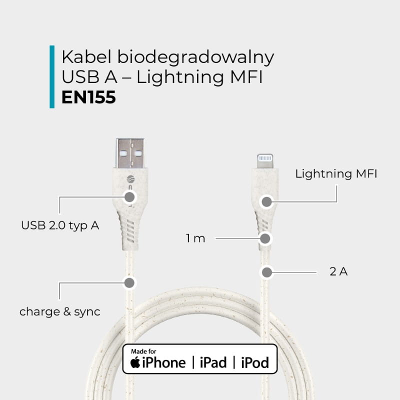 Przewód USB A - Lightning EN155 to ekologiczne rozwiązanie stworzone z myślą o użytkownikach urządzeń Apple, takich jak iPhone, iPad, AirPods czy iPod touch. Wykonany z biodegradowalnych polimerów roślinnych i słomy pszenicznej, przewód zapewnia nie tylko doskonałą funkcjonalność, ale także minimalizuje wpływ na środowisko.