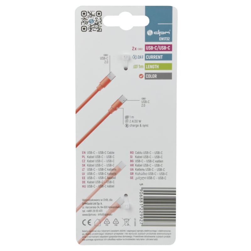 Przewód USB C - C to praktyczne akcesorium umożliwiające ładowanie oraz transmisję danych pomiędzy urządzeniami wyposażonymi w port USB-C. Dzięki standardowi USB 2.0 i obsłudze ładowania o maksymalnym natężeniu 2 A (30 W) zapewnia stabilne i efektywne działanie. Długość 1 m sprawia, że przewód jest wygodny w codziennym użytkowaniu, a jego pomarańczowy kolor dodaje eleganckiego wyglądu.