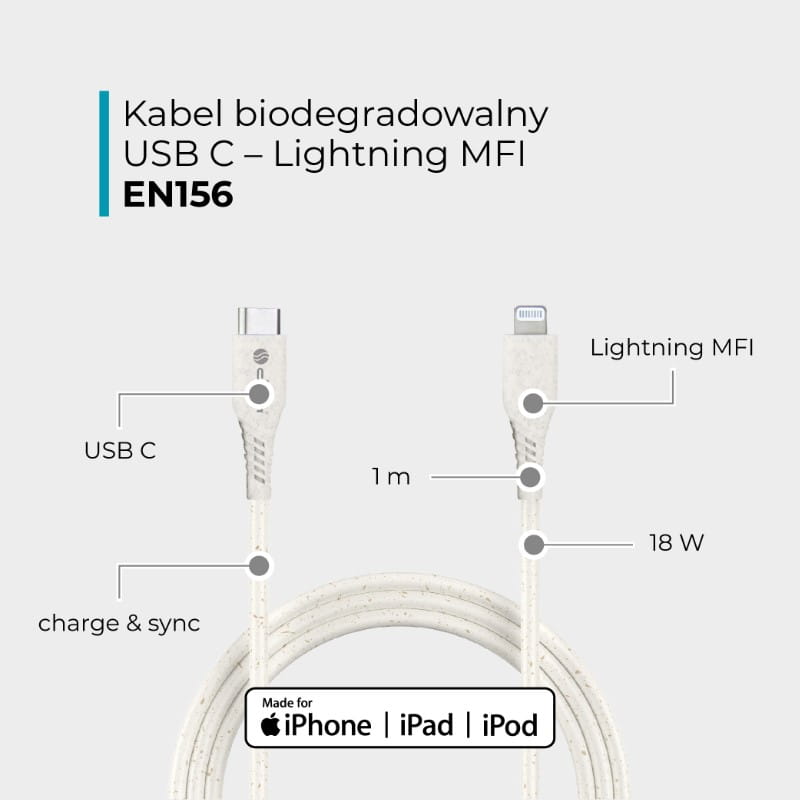 Przewód USB C - Lightning EN156 to ekologiczne i funkcjonalne rozwiązanie stworzone dla użytkowników urządzeń Apple. Wykonany z biodegradowalnych polimerów roślinnych i słomy pszenicznej, kabel łączy nowoczesną technologię z troską o środowisko.