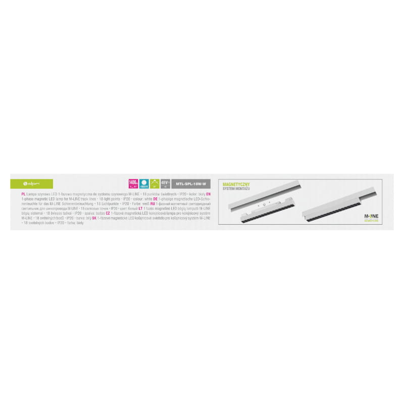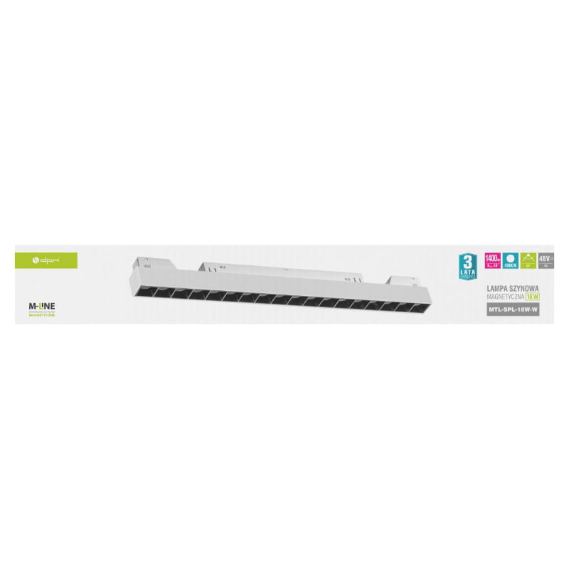Reflektor liniowy MTL-SPL-18W-W wyposażony w aż 18 punktów świetlnych, oferuje moc 18 W i strumień świetlny 1400 lm, zapewniając jasne i równomierne oświetlenie.