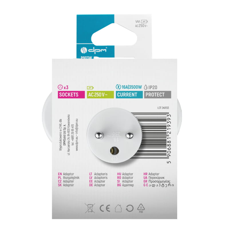 Dzięki kompaktowym wymiarom, rozgałęźnik P903W zajmuje niewiele miejsca, co czyni go wygodnym w użyciu nawet w ograniczonej przestrzeni. Jego biały kolor nadaje mu klasyczny, neutralny wygląd, który doskonale pasuje do większości wnętrz.