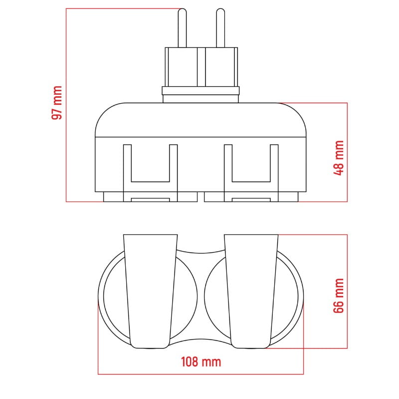 Rozgałęźnik wtyczkowy z dwoma gniazdami z uziemieniem i przesłonami torów prądowych.