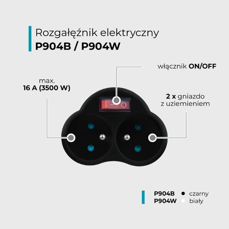 Rozgałęźnik P904B obsługuje maksymalne obciążenie 16 A (3500 W), co czyni go idealnym do zasilania sprzętów o większej mocy, takich jak elektronika użytkowa, sprzęt AGD czy narzędzia. Dzięki temu jest to uniwersalne urządzenie, które sprawdzi się w różnych zastosowaniach.
