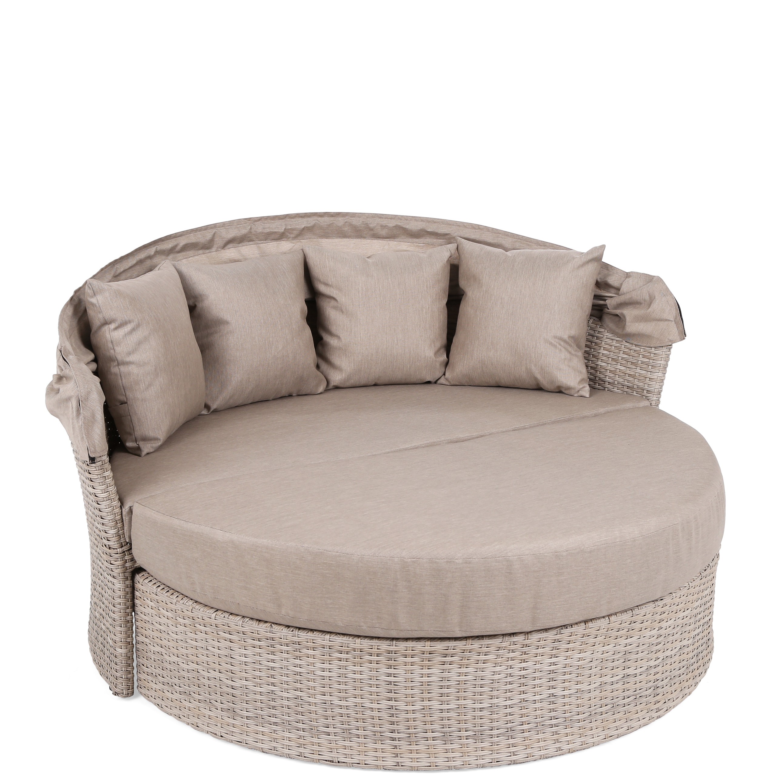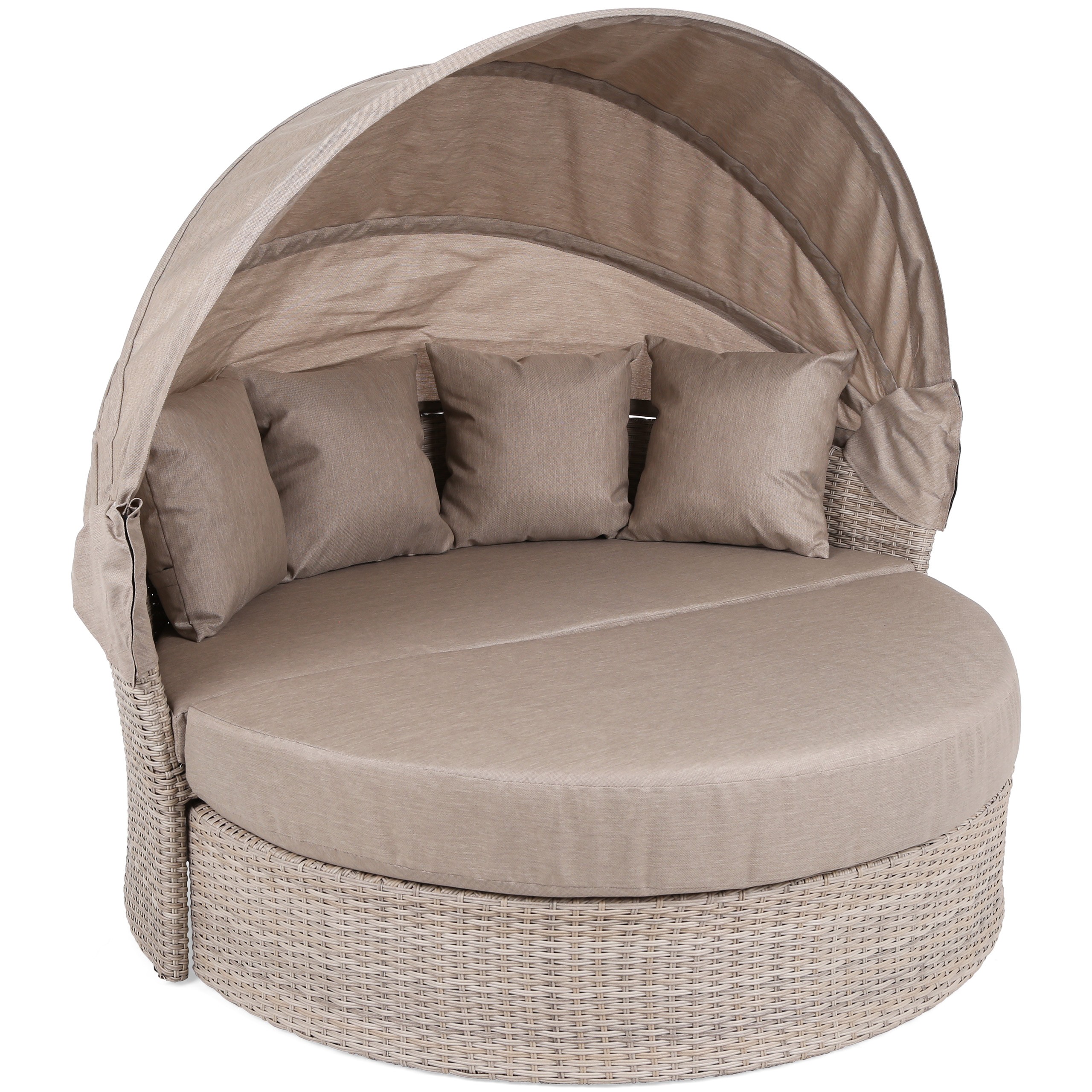 - Poduchy: materiał pokrycia poduch i baldachimu impregnowany (odporny na wilgoć), pokrycie wymienne, zapinane na zamek błyskawiczny (można czyścić), wymiary poduch siedziska: 142 cm x 69 cm x 16 cm (1 szt.), 147 cm x 72 cm x 8 cm (1 szt.), wymiary poduchy oparcia: 38 cm x 38 cm x 14 cm (4 szt.).