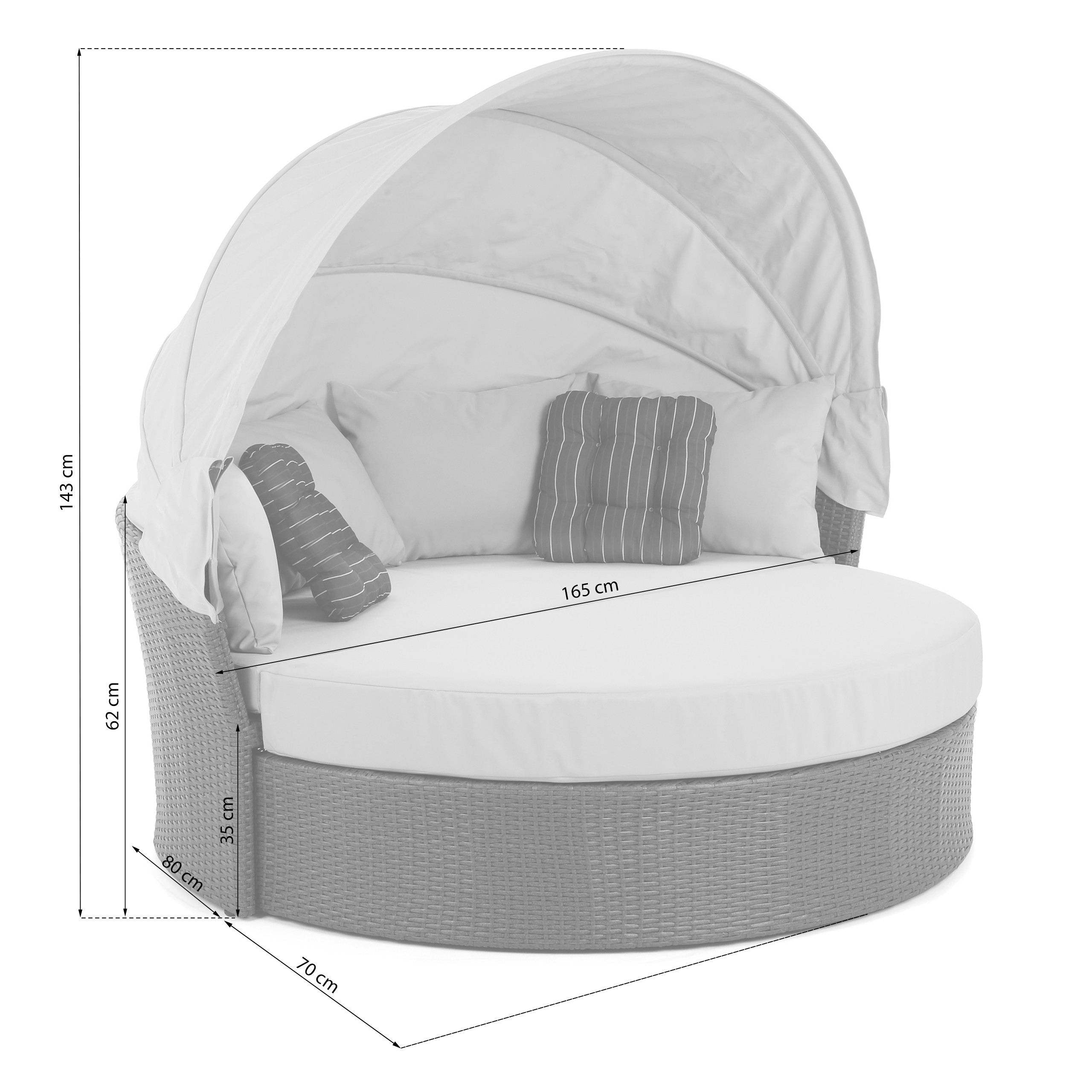 - Poduchy materiał pokrycia poduch i baldachimu impregnowany (odporny na wilgoć), pokrycie wymienne, zapinane na zamek błyskawiczny (można czyścić), wymiary poduch siedziska: 142 cm x 69 cm x 16 cm (1 szt.), 147 cm x 72 cm x 8 cm (1 szt.), wymiary poduchy oparcia: 38 cm x 38 cm x 14 cm (4 szt.).