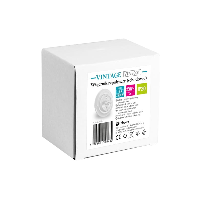 Włącznik podtynkowy VIN5001 można stosować również jako włącznik pojedynczy, który służy do zapalania oraz gaszenia jednego źródła światła. Ponadczasowy wygląd i styl ceramicznego włącznika obrotowego w kolorze białym bardzo dobrze będzie pasować zarówno do wnętrz retro jak i nowoczesnych. Włącznik sprzedawany jest razem z ramką pojedynczą, kompletny i gotowy do montażu podtynkowego.