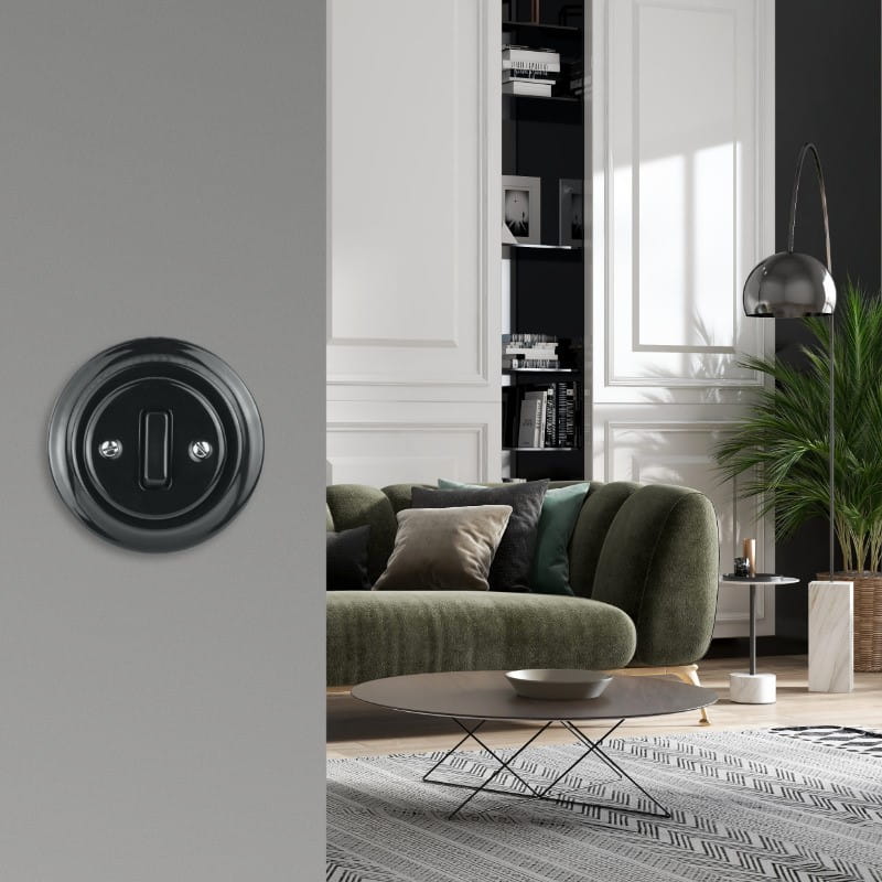 Ponadczasowy wygląd i styl ceramicznego włącznika w kolorze czarnym bardzo dobrze będzie pasować zarówno do wnętrz retro jak i nowoczesnych. Włącznik sprzedawany jest razem z ramką pojedynczą, kompletny i gotowy do montażu podtynkowego.