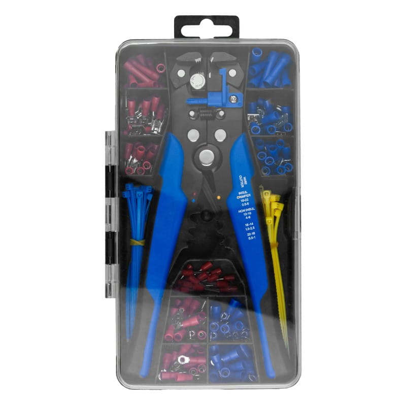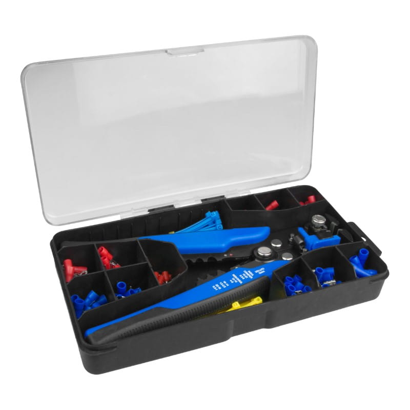 - Zestaw konektorów izolowanych (22-14 AWG, 0.5-2.5 mm2): 20 x cylindryczne, 30 x płaskie, 30 x wciskane, 30 x widełkowe, 20 x tulejkowe, 40 x oczkowe (M3, M4).