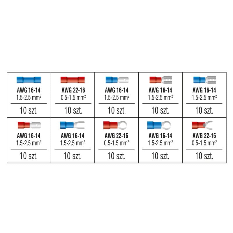 Zestaw zawiera 100 sztuk konektorów w czterech najczęściej używanych rodzajach: oczkowych, widełkowych, cylindrycznych oraz płaskich. Dzięki temu jest odpowiedni do szerokiej gamy zastosowań, od instalacji elektrycznych w domu po zaawansowane projekty techniczne. Wszystkie elementy są starannie zapakowane w pudełko, co ułatwia przechowywanie i transport.